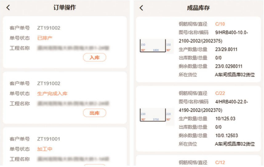 库存管理分为原料与成品的库存信息,包括入库、出库,使用情况的详细信息整理。设备完成生产进行入库,根据成品生产情况及原料的消耗,完成出库及使用台账的数据汇总。监控库存信息,有效的优化加工方案,减少钢筋原材的消耗,改善传统生产环节难以管控的现状,提升钢筋在生产环节的效率和质量,进一步降低项目成本。